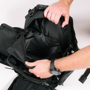- Secure your IWB holster inside the bag with a central support tether (seamless transition from on-body to off-body without leaving the holster)