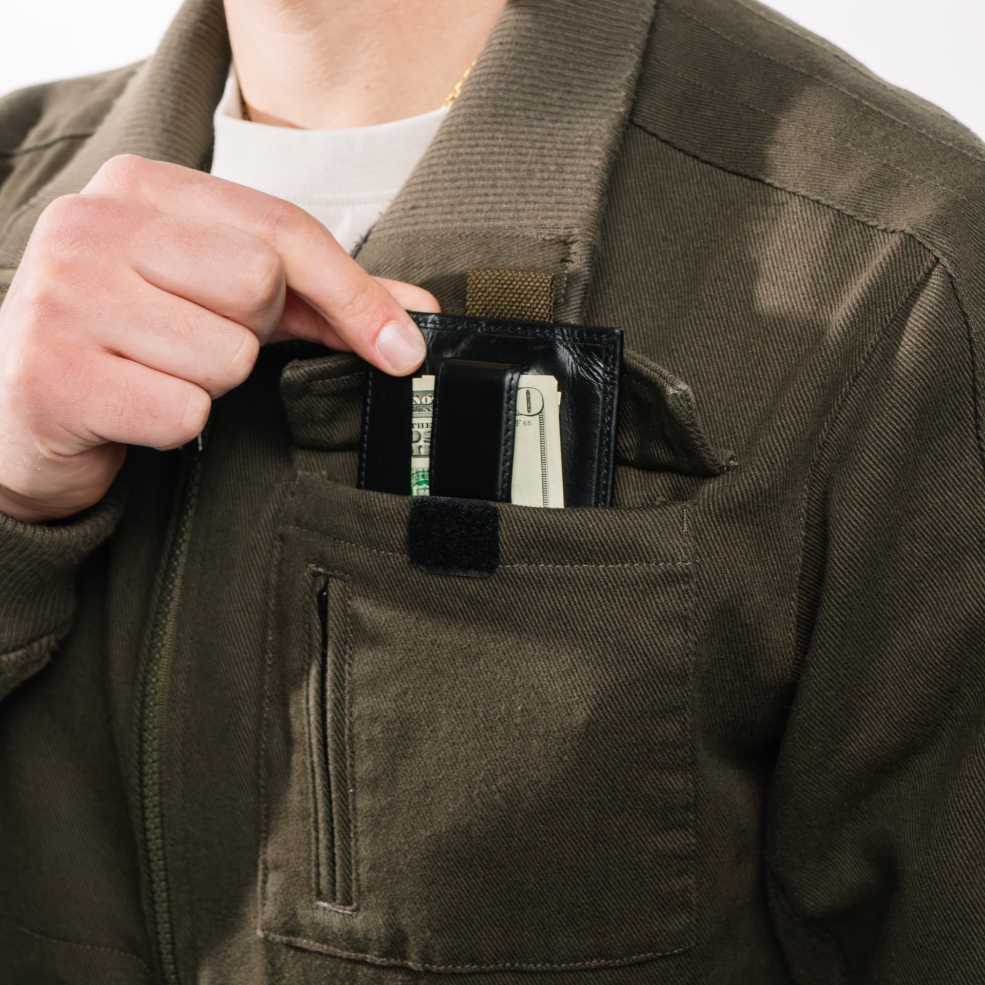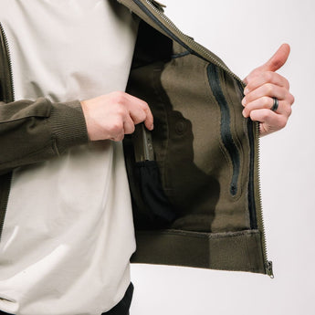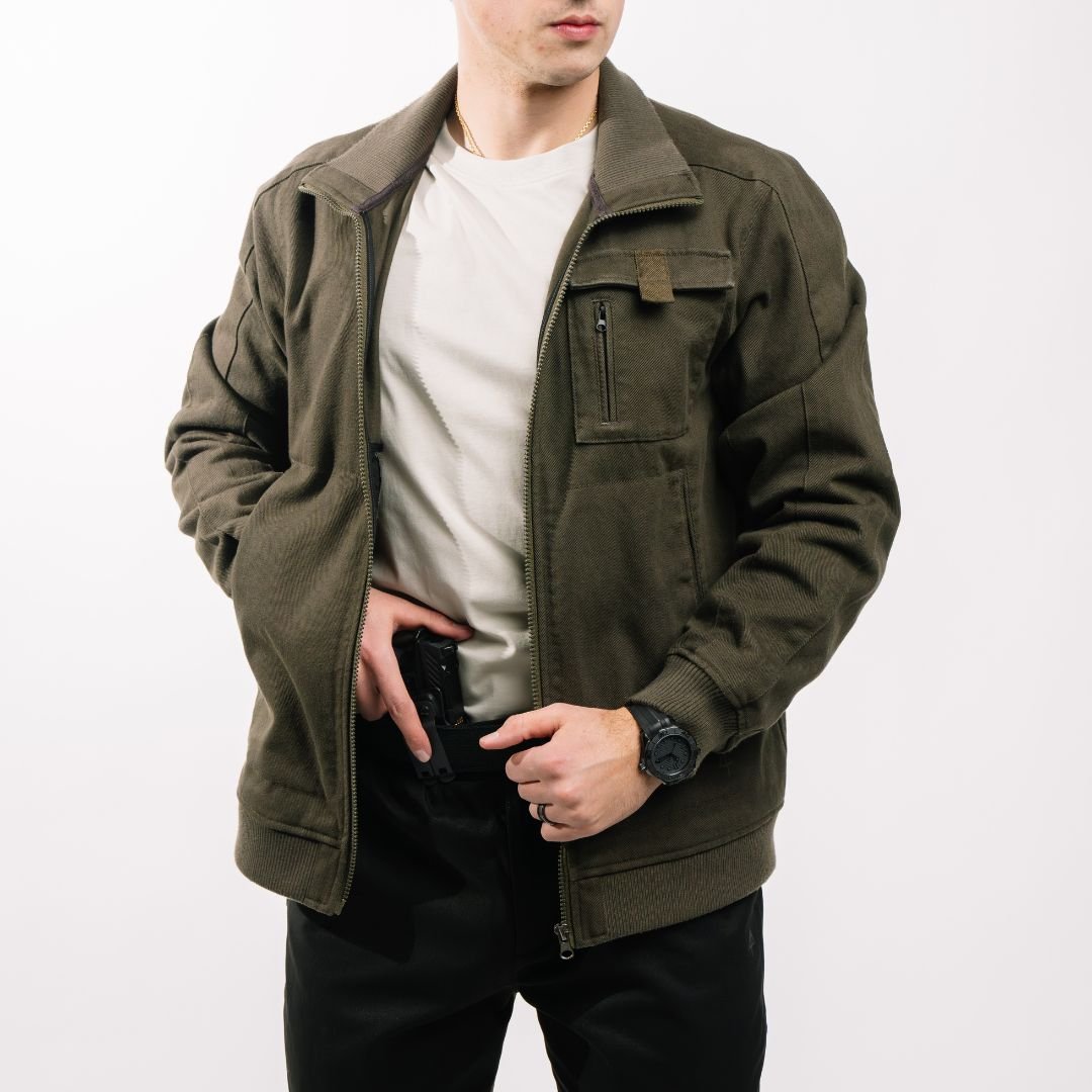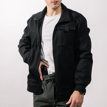 NOTE: The Utility Bomber Jacket is designed to enhance your concealed carry setup. Always use a properly-fitting IWB holster affixed to a supportive waistband.